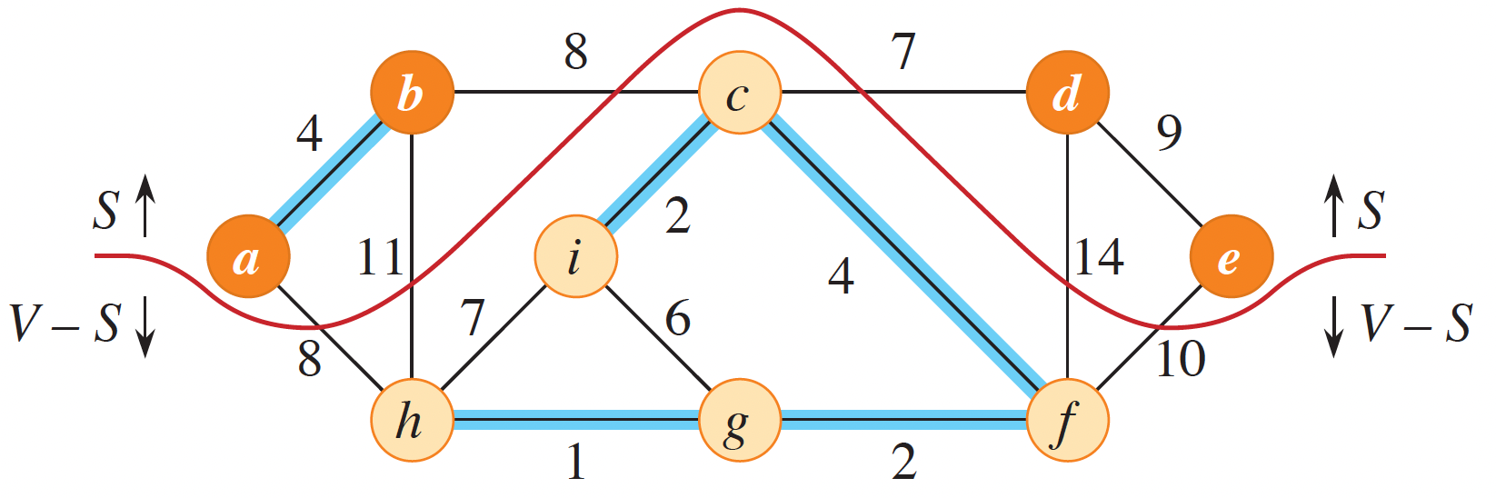 Each edge \(e\) that is added must result in a tree that is a subset of the minimum spanning tree. The challenge of this algorithm is actually finding such an edge. How would we know such an edge if we saw it? We first need to define a few properties which will shine light on this.